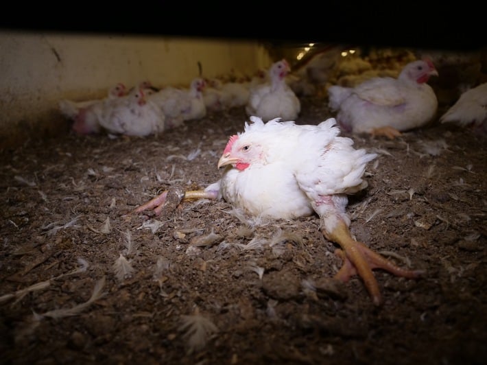 Moderne Masthühner sind so gezüchtet, dass sie innerhalb von rund 30 Tagen ein Gewicht von anderthalb bis zwei Kilogramm erreichen. Besonders die Schenkel- und Brustmuskulatur wird unnatürlich groß, weil sich diese Körperteile besonders gut verkaufen lassen. Knochen und Organe kommen bei dem explosionsartigen Massezuwachs nicht hinterher. Schmerzen, Knochendeformationen und Organversagen sind die Folgen.