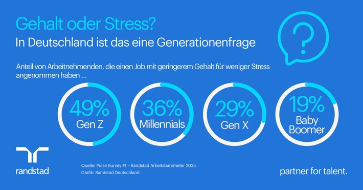 „Gehalt motiviert – aber nur, wenn der Stress nicht überhand nimmt“, sagt Verena Menne, Director Group HR bei Randstad Deutschland. Dies gilt besonders für die jüngeren Generationen: Bei der Generation Z hat knapp die Hälfte (49 %) bereits ein höheres Gehalt für weniger Stress durch einen Jobwechsel getauscht – bei den Millennials sind es 36 %, bei der Gen X 29 %, bei den Babyboomern allerdings nur 19 %.