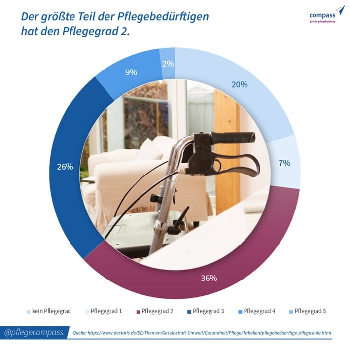 Nach aktuellsten Zahlen des Statistischen Bundesamtes (2021) sind die allermeisten der rund 5 Mio. Menschen mit einer festgestellten Pflegebedürftigkeit – nämlich 40,8 Prozent – in den Pflegegrad 2 eingestuft. Die Erhebungen der bundesweit tätigen compass private pflegeberatung GmbH zeigen, dass diese Verteilung seit der Einführung der Pflegegrade stabil ist. Die Leistungen umfassen alle Lebenslagen