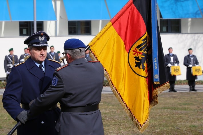 Mit Übergabe der Truppenfahne übertrug der Kommandeur Gesundheitseinrichtungen das Kommando symbolisch an Oberstarzt Dr. Ralf Hartmann, der bereits bis 2019 der Klinische Direktor der Klinik für Dermatologie und Venerologie des Hauses war.