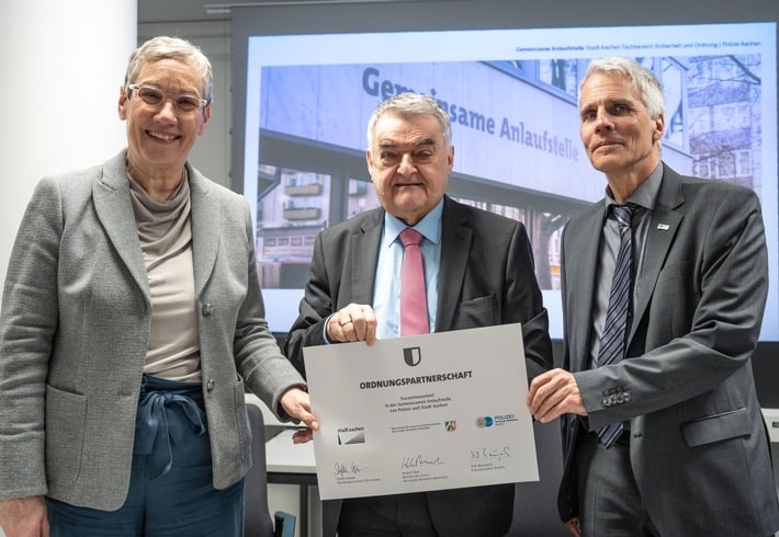 Während des Besuchs besiegelten NRW-Innenminister Reul, Oberbürgermeisterin Keupen und Polizeipräsident Weinspach die Ordnungspartnerschaft mit ihrer Unterschrift und bestätigten damit die gute Zusammenarbeit.