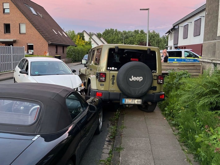 Nach dem aktuellen Kenntnisstand befuhr der 21-jährige Mann aus Enger gegen 21:20 Uhr mit einem Seat Ibiza die Hainteichstraße, in Richtung Babenhauser Straße, mit stark überhöhter Geschwindigkeit und in Schlangenlinien. In Höhe der Stennerstraße verlor er die Kontrolle über seinen Pkw und kollidierte mit einem geparkten Jeep Wrangler Unlimited, der wiederum auf einen geparkten Mazda MX-5 geschoben wurde. Der Gesamtschaden wurde durch die Polizisten auf rund 25000 Euro geschätzt.