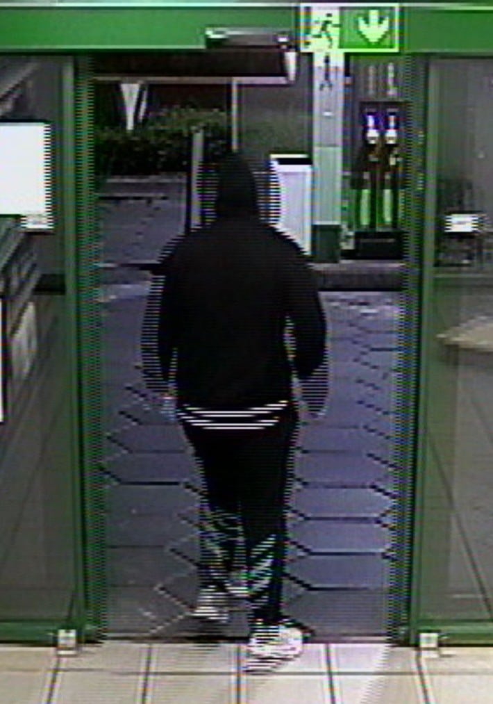 Der Mann war etwa 20 Jahre alt und circa 180 cm groß. Er trug einen schwarzen Bart und war mit einem schwarzen Kapuzenpullover, einer schwarzen Hose mit weißen Applikationen und weißen Nike Schuhen mit roten Flecken bekleidet. Die Kapuze hatte er aufgesetzt und vor dem Gesicht trug er eine schwarz, rote Verkleidungsmaske.