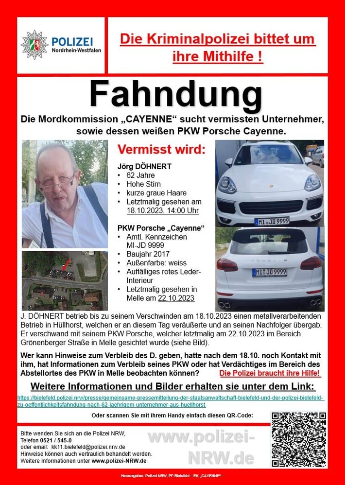 Die Ermittler haben bislang keine Informationen, wo sich der vermisste Unternehmer befinden könnte. Genauso wichtig sind für sie Hinweise zu dem verschwundenen weißen Porsche Cayenne des 62-Jährigen. Der auffällige SUV stand zuletzt am Sonntag, 22.10.2023, in Melle an der Grönenberger Straße. Details zu der Suche sind auf dem abgebildeten Fahndungsplakat benannt.