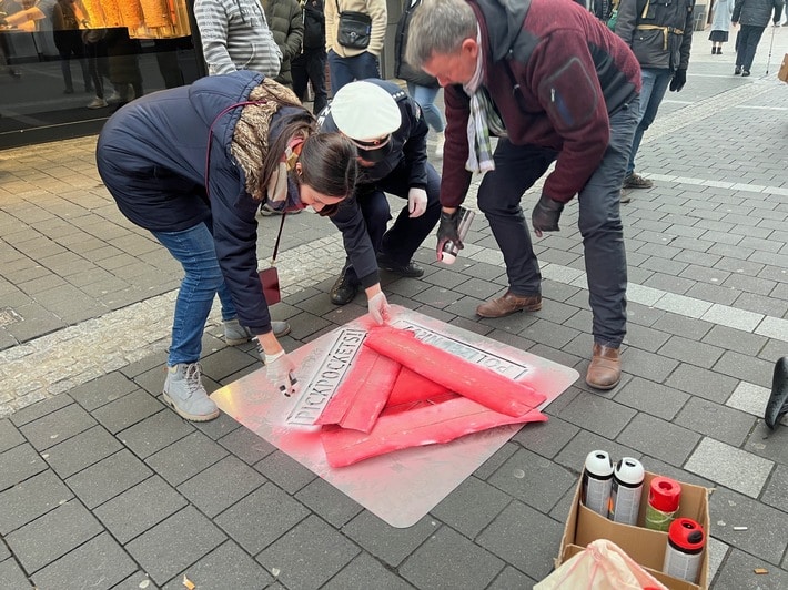 Mit großflächigen Warnungen auf dem Weihnachtsmarkt in der Bonner Innenstadt sowie auf dem Nikolausmarkt in Bad Godesberg warnt die Bonner Polizei vor der Gefahr durch Taschendiebe. Die Hinweise in Form eines Verkehrsschildes sind auf den wichtigsten Verkehrsachsen aufgesprüht.