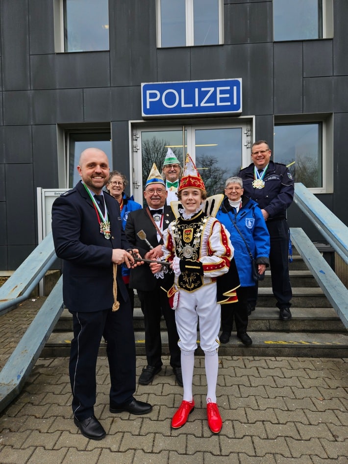 Mit einem dreifachen „Düren Alaaf“ „Polizei Alaaf“ „Kinderkarneval Alaaf“ überreichte Prinz Fynn I. den Beamten zum Abschluss voller Begeisterung Karnevalsorden. Im Gegenzug erhielt er den symbolischen Schlüssel der Polizeiwache Düren von Polizeioberkommissar Sebastian Cremer, stellvertretend für die Kreispolizeibehörde Düren, als Zeichen seiner „Machtübernahme“ bis zum Ende der „tollen Tage“.
