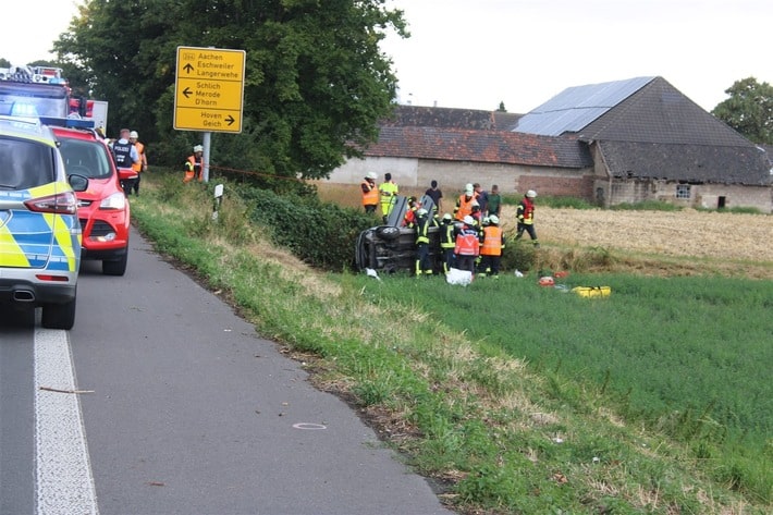 Gegen 15:40 Uhr war der 60 Jahre alte Pkw-Fahrer in Richtung Langerwehe gefahren. Kurz vor der Einmündung nach Obergeich kam er vor den Augen anderer Verkehrsteilnehmer ohne Fremdeinwirkung nach rechts von der Bundesstraße ab. Dabei überfuhr der Wagen ein Verkehrszeichen und überschlug sich auf dem abfallenden Böschungsgelände, blieb schließlich auf der Beifahrerseite liegen, während der 60-Jährige noch angegurtet im Fahrersitz hing. Nachdem der Mann befreit werden konnte, zog die Feuerwehr den Wagen wieder zurück auf die Fahrbahn; der Verletzte wurde durch den Rettungsdienst ins Krankenhaus gebracht.