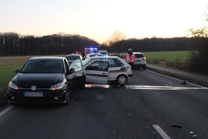 Gegen 17:12 Uhr befuhr ein 64-Jähriger aus Stetternich die L264 aus Welldorf kommend in Richtung Stetternich. Vor ihm fuhr eine 36-Jährige aus Koslar, die stark verlangsamte, um an einem stehenden Auto vorbeizufahren. Diese übersah der Mann aus Stetternich und fuhr von hinten auf ihr Fahrzeug auf. Dadurch geriet das Auto der 36-Jährigen in den Gegenverkehr. Sie kollidierte hier zunächst mit dem Auto eines 71-Jährigen aus Welldorf und schließlich mit einem weiteren vorausfahrenden Wagen, gefahren von einem 67-Jährigen aus Mönchengladbach. Währenddessen geriet auch der 64-Jährige in den Gegenverkehr und stieß dort mit dem Fahrzeug einer 23-Jährigen aus Welldorf zusammen.