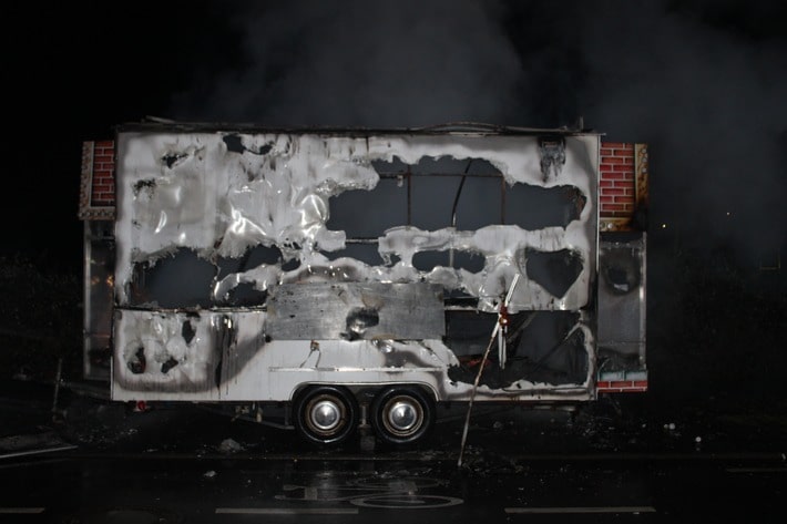 In der Nacht von Freitag (16.02.2024) auf Samstag (17.02.2024) brannte im Düren ein Imbisswagen vollständig aus. Die Kriminalpolizei hat Ermittlungen zur Brandursache aufgenommen.