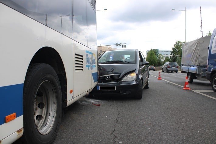 Bei einer innerstädtischen Kollision mit einem Linienbus erlitten am Freitagnachmittag zwei Menschen Verletzungen. Es entstanden temporäre Verkehrsbeeinträchtigungen.