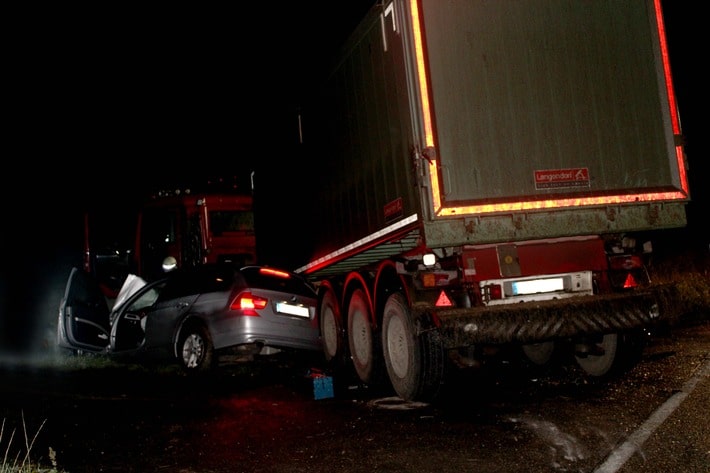 Ein 29-jähriger Lkw-Fahrer aus Titz war am frühen Morgen auf der B57 in Fahrtrichtung Gereonsweiler unterwegs, gefolgt von einem 27-jährigen Autofahrer aus Aachen. Vor einem nach links abgehenden Feldweg setzte der Lkw-Fahrer seinen Blinker und verringerte die Geschwindigkeit. Der Aachener setzte zeitgleich zum Überholvorgang an. Als der Lkw-Fahrer dann zum Abbiegen ansetzte, kam es zur Kollision. Erst im angrenzenden Feld kamen die Fahrzeuge zum Stillstand, der Pkw wurde dabei zwischen Sattelschlepper und Auflieger eingeklemmt. Der 27-jährige Autofahrer wurde schwer verletzt durch einen Rtw in ein nahegelegenes Krankenhaus gebracht.