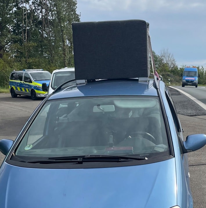 Ein potenziell lebensgefährliches Unterfangen beendete die Polizei Dortmund am gestrigen Montag (18. September) gegen 12 Uhr auf der A445 in Richtung Hamm. Die Beamtinnen und Beamten der Autobahnpolizeiwache Arnsberg zogen am Ausbauende in Werl ein Auto aus dem Verkehr, auf dessen Dach ein Sofa geschnallt war.