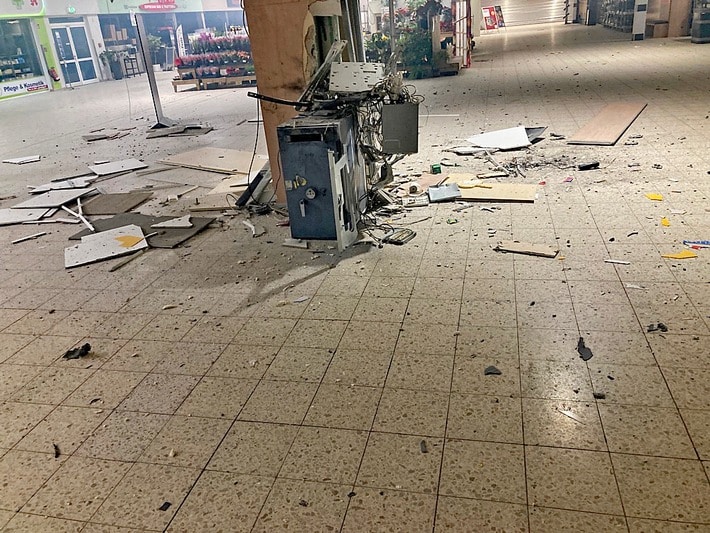 Gegen 4 Uhr nahm ein Zeuge zunächst einen lauten Knall und kurz darauf eine Explosion wahr. Ebenfalls wurde am Haupteingang des Einkaufscenters „Nebel“ bemerkt.