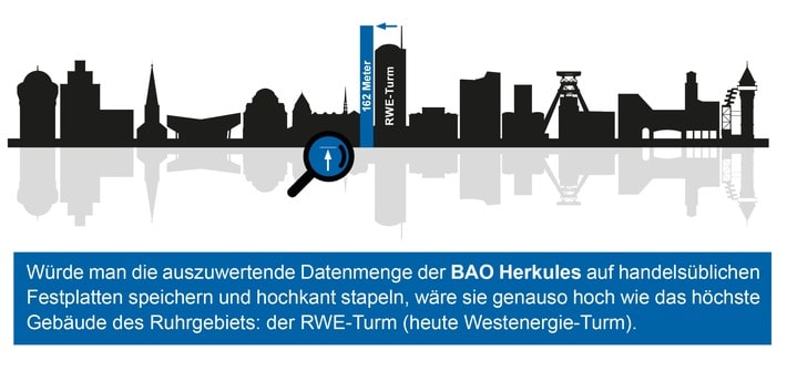Die Menge der ausgewerteten Daten konnte in den vergangenen 12 Monaten durch die BAO Herkules mehr als verdoppelt werden und dies ist auch dringend nötig. Denn aus jeder Durchsuchung resultieren weitere sichergestellte Datenträger, die ausgewertet werden müssen. Der Name der BAO deutet bereits auf die Herkulesaufgabe hin, der die Ermittler nachgehen: Würde man aktuell die auszuwertende Datenmenge der BAO Herkules auf handelsüblichen Festplatten speichern und hochkant stapeln, wäre sie genauso hoch wie das höchste Gebäude des Ruhrgebiets: der RWE-Turm (heute Westenergie-Turm) – nämlich 162 Meter.
