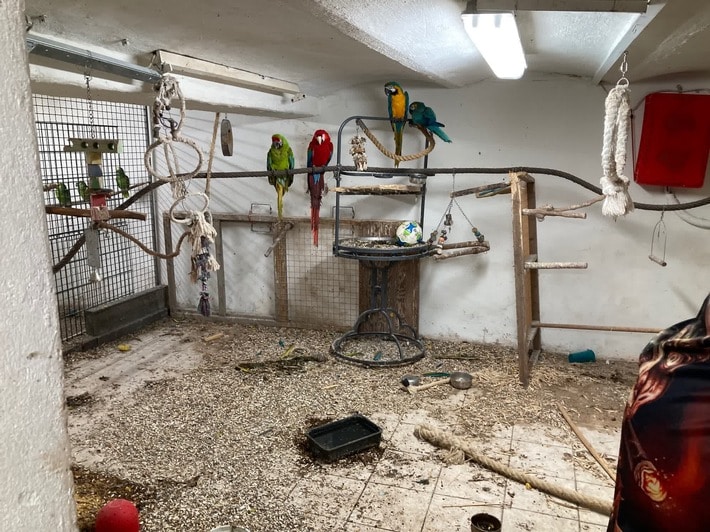 Insgesamt fanden die Einsatzkräfte etwa 60 Tiere vor. Neben Hunden, Hühnern, Enten, Gänsen, Wachteln und Hasen lebten auch 28 Papageien verschiedener Gattungen in dem Haus, die durch das Bundesnaturschutzgesetz besonders geschützt sind. Eine Haltung dieser geschützten Vögel ist grundsätzlich verboten und nur in Ausnahmefällen erlaubt.