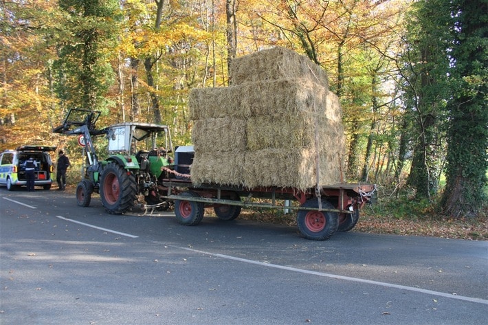 Bei der Überprüfung wurden sowohl am Ackerschlepper, als auch am Anhänger diverse technische Mängel sowie die mangelhafte Beladung des Anhängers festgestellt. Zudem war die Landmaschine bereits seit Dezember 2021 außer Betrieb gesetzt und der Anhänger ebenfalls nicht zugelassen.