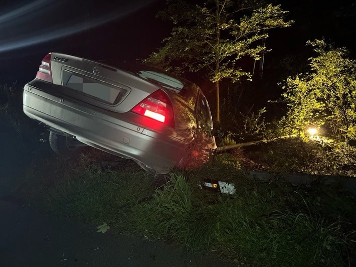 Ein 21-jähriger Autofahrer verlor in der Nacht auf Montag (15.07.2024) in Dahl die Kontrolle über seinen PKW und kam von der Fahrbahn ab. Der Hagener fuhr, gegen 01.45 Uhr, mit seinem Mercedes aus der Hagener Innenstadt kommend über die Dahler Straße. An der Einmündung zur Straße Finking wollte er nach links abbiegen und verlor dabei aus bislang ungeklärter Ursache die Kontrolle über das Auto. Er kollidierte mit einer Straßenlaterne und einem Leitpfosten. Das Auto kam an einem leichten Abhang zum Stehen. Weder der 21-jährige Fahrer noch seine vier Mitfahrer wurden bei dem Unfall verletzt. Während der Unfallaufnahme stellte sich heraus, dass der 21-Jährige nicht im Besitz einer gültigen Fahrerlaubnis war. Außerdem zeigte ein Atemalkoholtest einen Wert von knapp 1,5 Promille an. Ein Drogentest schlug auf Kokain an. Der Fahrer musste eine Blutprobe abgehen. Das Verkehrskommissariat ermittelt nun wegen des Fahrens ohne Fahrerlaubnis sowie der Gefährdung des Straßenverkehrs nach Alkohol- und Drogenkonsum. (sen)