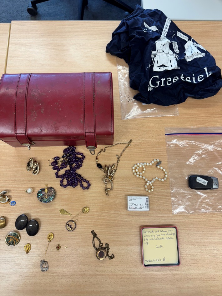 Bereits am Dienstag (14.10.2025) fand ein Zeuge unter anderem mehrere Schmuckstücke sowie einen Fahrzeugschlüssel. Die Ermittler der Kriminalpolizei schließen nicht aus, dass es sich bei den Gegenständen um Diebesgut handelt.