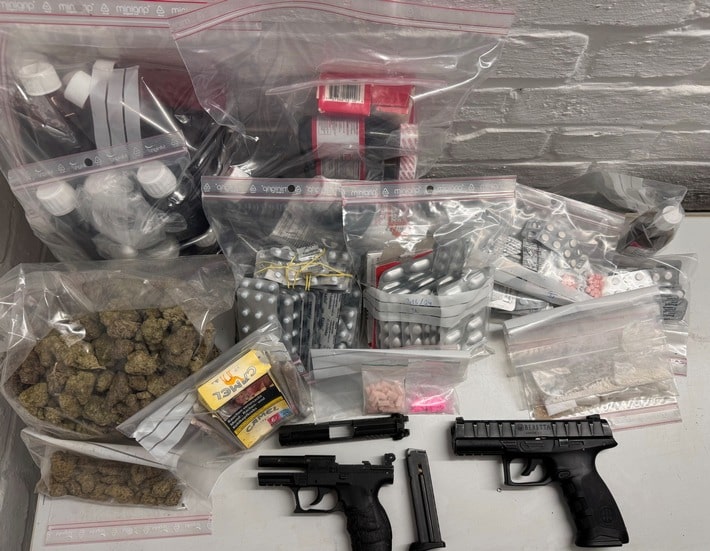 Ein mittlerer dreistelliger Bargeldbetrag, Mobiltelefone und zwei zerlegte PTB- und Druckluft-Handfeuerwaffen komplettierten den Durchsuchungserfolg.