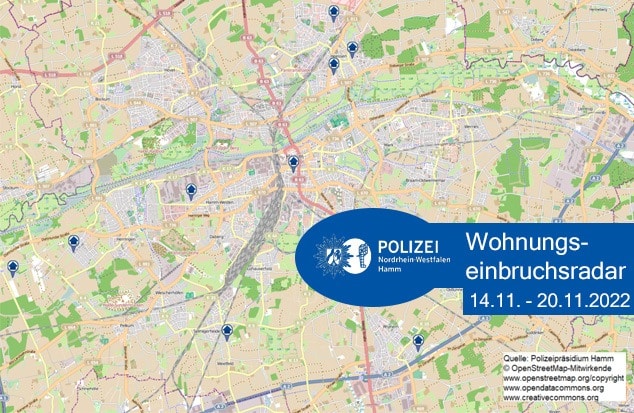 In der Woche vom 14. November bis 20. November 2022 gab es im Stadtgebiet zwei versuchte und sieben vollendete Einbruchsdelikte. Das zeigt das „Wohnungseinbruchsradar“ der Polizei Hamm.