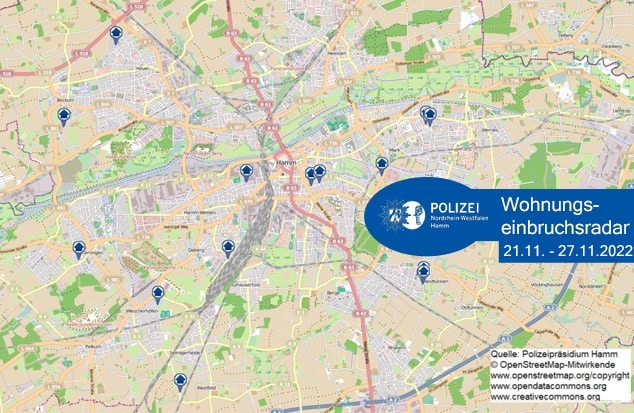 In der Woche vom 21. November bis 27. November 2022 gab es im Stadtgebiet sieben versuchte und acht vollendete Einbruchsdelikte. Das zeigt das „Wohnungseinbruchsradar“ der Polizei Hamm.