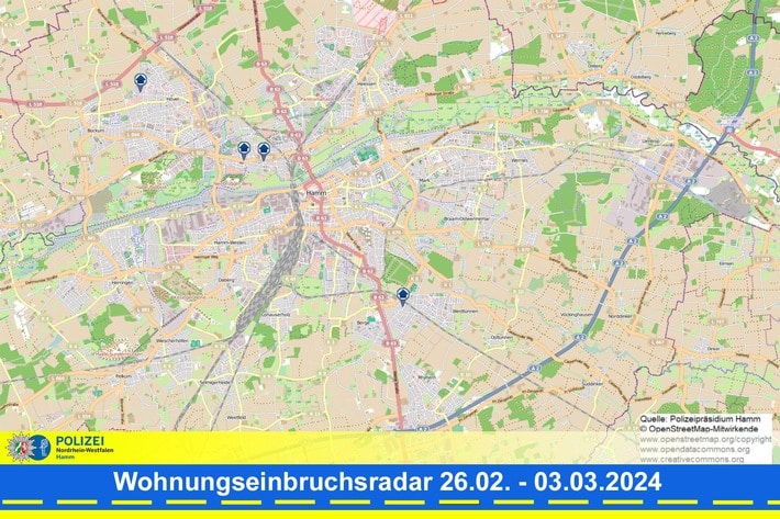 In der Woche vom 26. Februar bis 3. März 2024 gab es im Stadtgebiet ein versuchtes und drei vollendete Einbruchsdelikte. Das zeigt das „Wohnungseinbruchsradar“ der Polizei Hamm.