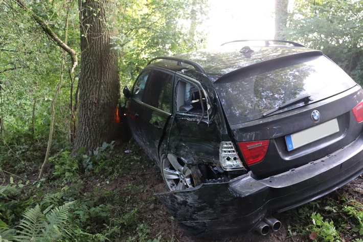 (jd) Am Sonntag (27.8.) ereignete sich um 19.10 Uhr auf der Straße An den Teichen ein Verkehrsunfall. Ein 20-jähriger Herforder fuhr mit seinem BMW in Richtung Amselstraße, als er im Bereich einer Linkskurve auf der regennassen Fahrbahn die Kontrolle über sein Auto verlor. Das Auto kam linksseitig von der Fahrbahn ab und prallte dort mit dem Heck gegen einen Baum. Aufgrund des starken Aufpralls wurde das Auto mit der Vorderseite gegen einen weiteren Baum geschleudert. Hier kam der BMW dann zum Stillstand. Der 20-jährige Fahrer blieb unverletzt, sein 15-jähriger Beifahrer, der ebenfalls aus Herford stammt, zog sich leichte Verletzungen zu. Er wurde mittels eines Rettungswagens in ein nahegelegenes Krankenhaus gebracht und seine Erziehungsberechtigten wurden über den Unfall benachrichtigt. Der Sachschaden liegt bei rund 10.000 Euro.