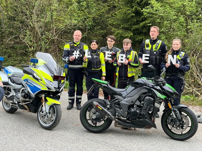 PHK Wieczorek, POKin Bulu (beide VD Paderborn), Kawasakifahrer Sören Bade (26 Jahre), FOS-Praktikant John Luc Hildebrandt (VD Höxter, 16 Jahre), PK Göppert (VD Paderborn) und PHKin Theresa Arendes (VD Höxter).