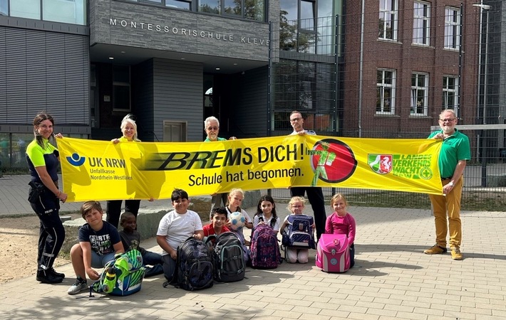Besonders für Schulneulinge, egal ob die sogenannten „i-Dötzchen“ oder auch die Schülerinnen und Schüler, die ab nun eine weiterführende Schule besuchen, kann der Morgen, bereits vor Unterrichtsbeginn, stressig werden. Auf den Schulwegen, auf welchen für viele Kinder nun neue Herausforderungen warten, wurden zur Sensibilisierung der Verkehrsteilnehmenden wieder kreisweit die von Verkehrswacht und Unfallkasse NRW zur Verfügung gestellten Banner der Aktion „Brems Dich! Schule hat begonnen“ aufgehängt.