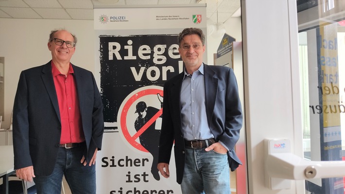 Dazu beraten die Präventionsexperten der Krefelder Kriminalpolizei im Rahmen der landesweiten Kampagne „Riegel vor!“: Frank Ishorst (links) und Eden Nickel geben kostenlos Tipps rund um den Einbruchschutz: am Freitag, dem 27. Oktober (16 bis 20 Uhr) und am Samstag darauf (10 bis 14 Uhr) mit einem Infostand im Eingangsbereich des „Bauhaus“ auf der Mevissenstraße 75.