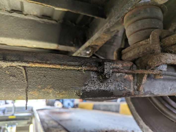 Hier wurden dann sage und schreibe 47 Mängel an dem umgebauten Fiat Ducato festgestellt. So war zum Beispiel der Hauptrahmen des Fahrzeugs komplett durchgerostet. Doch nicht nur das: Besonders gravierend war unter anderem die nicht mehr funktionsfähige Betriebsbremse der Hinterachse, wo der Bremskreislauf undicht war. Zudem verlor der Wagen jede Menge Öl und hatte Mängel an der Beleuchtung. Zu allem Überfluss fehlte auch noch die Fensterscheibe auf der Beifahrerseite komplett.