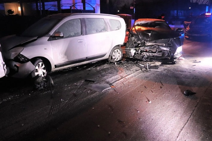Der 34-Jährige beschleunigte das Auto zwischenzeitlich auf eine Geschwindigkeit von circa 90 km/h in einer Tempo-30-Zone. Während seiner Flucht verlor er wegen der erhöhten Geschwindigkeit und dem wetterbedingten glatten Boden immer wieder die Kontrolle über sein Auto. Auf der Bachstraße kollidierte er in Höhe der Haunummer 93 im Kurvenbereich mit einem geparkten Fahrzeug. Durch den Zusammenstoß wurden vier weitere Autos ineinandergeschoben.