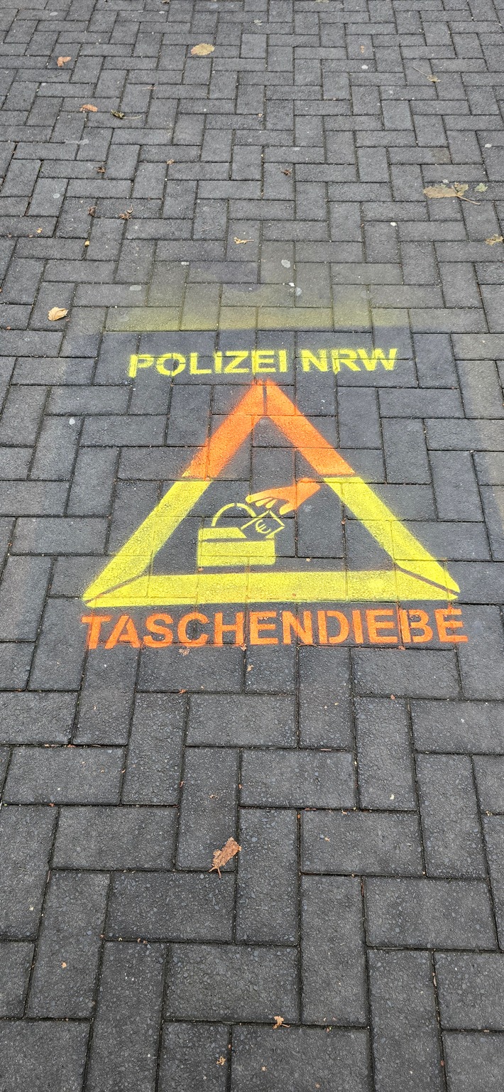Hierzu wurden am Montagvormittag, 6. Oktober 2025, in Hilden Piktogramme in der Fußgängerzone aufgesprüht, die vor Taschendieben warnen sollen. Zudem wurden Bürgerinnen und Bürger mittels Flyer und im Rahmen von zahlreichen Gesprächen vor den unterschiedlichen Maschen der zum Teil professionell agierenden Diebinnen und Dieben gewarnt.
