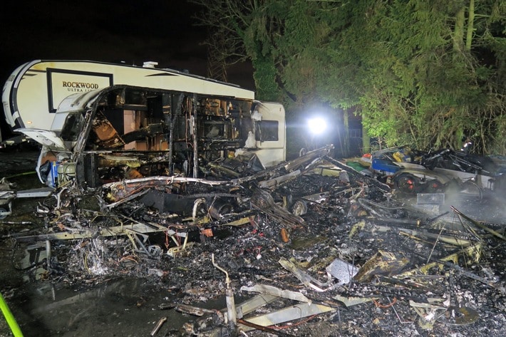 Zwei hinter den Metallcontainern abgestellte Wohnwagen brannten ebenfalls vollständig aus. Zwei weitere Wohnwagen wurden durch die Flammen und die daraus resultierende Hitze ebenfalls zum Teil stark beschädigt.