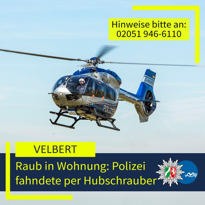 In Velbert sind am Mittwoch (16. Juli 2025) drei Täter in eine Wohnung in einem Mehrfamilienhaus an der Amselstraße eingedrungen. Dort bedrohten sie den Bewohner unter anderem mit einer Schusswaffe, ehe sie die Wohnung durchsuchten. Die Polizei hat mit einem Hubschrauber nach den Tätern gefahndet und die Ermittlungen aufgenommen.