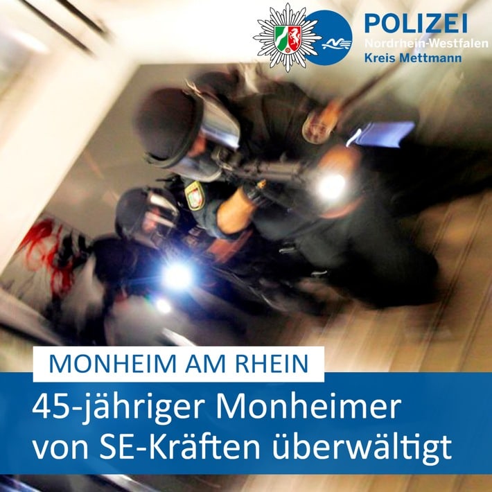 Da die Polizei nicht ausschließen konnte, dass der Mann Zugang zu Waffen haben könnte, wurden zur Lagebewältigung Spezialeinsatzkräfte hinzugezogen. Diese konnten den Monheimer gegen 12:30 Uhr in seinem Haus überwältigen, wobei der 45-Jährige leicht verletzt wurde.