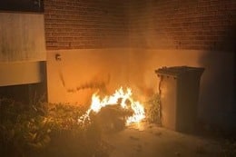 Gegen 2.40 Uhr entdeckten Zeugen einen weiteren Brand an der Hoffeldstraße auf Höhe der Hausnummer 24. Bislang unbekannte Tatverdächtige hatten einen Müllcontainer in Brand gesetzt, der komplett abbrannte. Durch das Feuer wurden eine nebenstehende Mülltonne sowie eine Hauswand beschädigt. Die Feuerwehr Hilden konnte den Brand schnell löschen. Personen wurden durch das Feuer nicht verletzt. Es entstand ein Sachschaden von rund 2.000 Euro.
