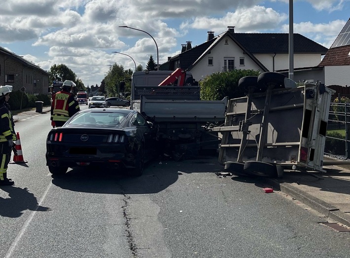 Ein Hüllhorster befuhr gegen 11:25 Uhr mit seinem Ford Mustang die Hauptstraße aus Richtung Ahlsener Straße kommend. Aus bislang ungeklärter Ursache prallte das Auto auf Höhe der Ziegelstraße gegen einen am rechten Fahrbahnrand geparkten Pritschenwagen samt Anhänger. Durch die Wucht der Kollision kippte der Anhänger um und kam auf dem Gehweg zum Liegen. Personen befanden sich weder im Fahrzeuggespann noch auf dem Gehweg.