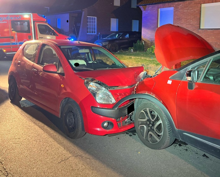 Ein 18-jähriger Petershäger befuhr gegen 05:30 Uhr im Dunkel der frühen Morgenstunden mit seinem Auto den Tinnenweg in Fahrtrichtung B482. Kurz vor der Einmündung Heckenweg geriet sein roter Nissan aus bislang ungeklärter Ursache nach links gegen den Kantstein eines Gehwegs. Der junge Mann verlor daraufhin die Kontrolle über seinen Pkw, prallte frontal gegen einen am Fahrbahnrand geparkten Renault und kam dort zum Stehen.