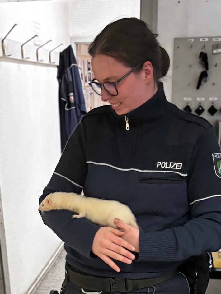 Samstag, gegen 19 Uhr, Menden: Ein junger Mann kommt mit einem Frettchen in unsere Wache. Er habe es in der Kolpingstraße gefangen. Die Polizeibeamten informieren die Tierhilfe. In seinem Übergangsquartier – einer Pappschachtel mit Luftlöchern – hält es den weißen Zeitgenossen nicht lange: Er knabberte sich immer wieder ein größeres Loch zum Durchschlüpfen.