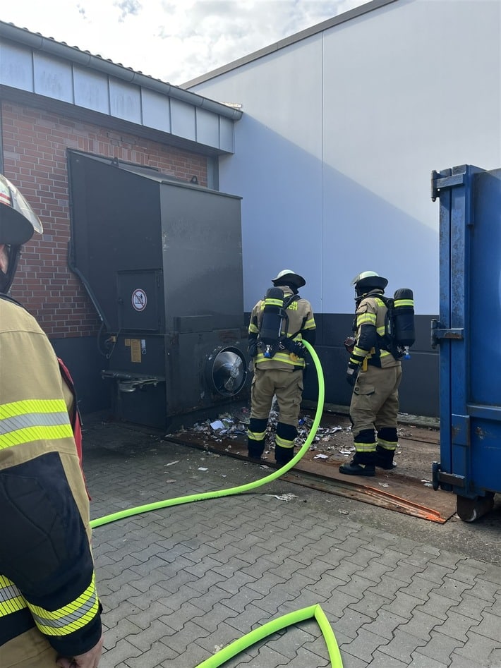 Durch Einsatzkräfte der Feuerwehr wurde der im Außenbereich befindliche Wertstoffcontainer von der Müllpresse getrennt und der Brand gelöscht. Personen kamen nicht zu Schaden.