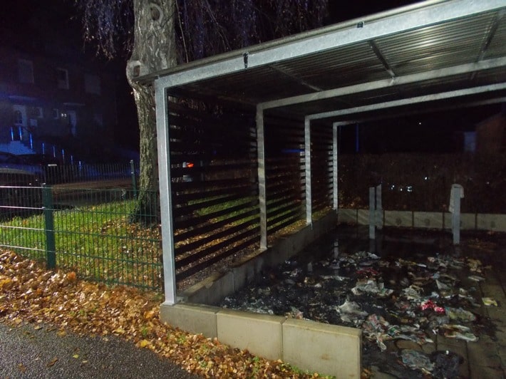Einsatzkräfte der Feuerwehr löschten vor Ort eine brennende Papiermülltonne, die in einem Unterstand, ähnlich einem Carport, abgestellt war. Das blaue Wertstoffbehältnis wurde komplett zerstört, die Holzverkleidung des Abstellplatzes wurde durch die Flammen ebenfalls beschädigt.
