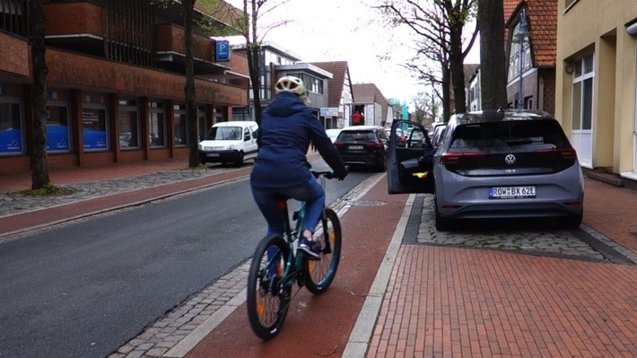 So genannte „Dooring“-Unfälle lassen sich leicht vermeiden, indem man etwa mit der Hand die Tür öffnet, die sich auf der anderen Seite befindet: Wenn Sie auf der Fahrerseite sitzen, greifen Sie mit der rechten Hand zur Tür, nicht mit der linken! Dadurch müssen Sie den Oberkörper automatisch eindrehen und blicken somit in den toten Winkel. Dies nennt man auch den „holländischen Griff“. Sie können so mögliche Radfahrende besser sehen.