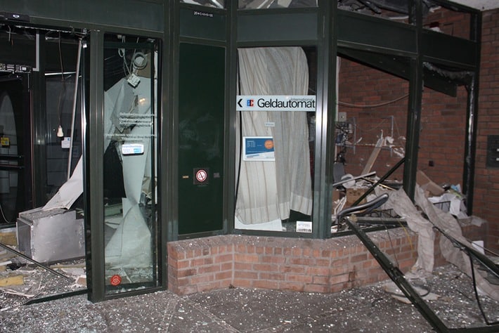 Der Vorraum der Bank wurde bei der Sprengung des Geldautomaten nicht unerheblich beschädigt. Ebenfalls in Mitleidenschaft gezogen wurden drei vor der Bank geparkte PKW.