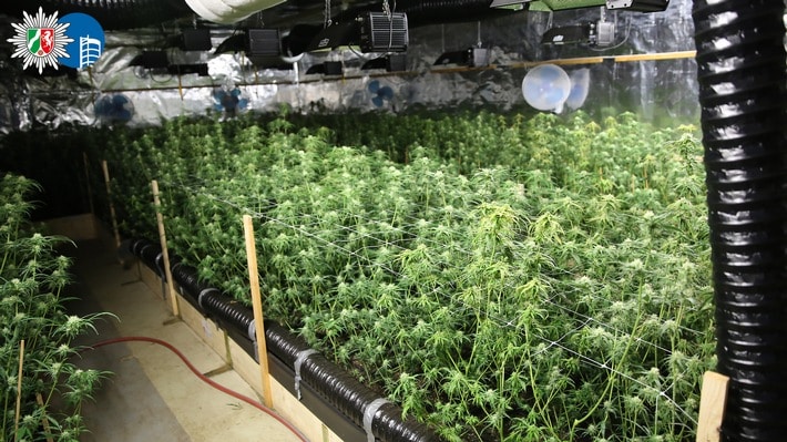 Bei den Durchsuchungsmaßnahmen der Räumlichkeiten (u.a. Garagen und Wohnungen) wurde eine professionell betriebene Cannabis-Plantage mit über 900 Pflanzen in Oberhausen entdeckt (siehe Foto); zusätzlich wurde BTM (darunter Marihuana und Kokain) im zweistelligen Kilobereich aufgefunden und sichergestellt. Diverse Waffen, Bargeld im fünfstelligen Bereich und mehrere Fahrzeuge, die den Beschuldigten zugeordnet werden, wurden ebenfalls gesichert.
