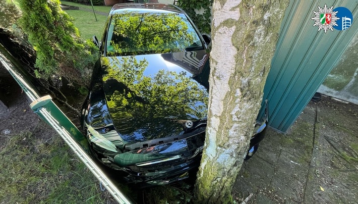 Ein lauter Knall schreckte die Anwohner der Lütticher Straße in Oberhausen-Schmachtendorf am späten Dienstagnachmittag (25.06.), um 17:54 Uhr, auf. Der Grund: Ein schwarzer Mercedes war in einem Vorgarten förmlich eingeschlagen und blieb vor einem Baum hängen. Der (un-) verantwortliche Fahrer flüchtete torkelnd von der Unfallstelle in Richtung Genterstraße. Ein Anwohner, der versuchte ihn an der Flucht zu hindern, wurde mit den Worten „Was willst du von mir?“ aggressiv abgeschreckt.
