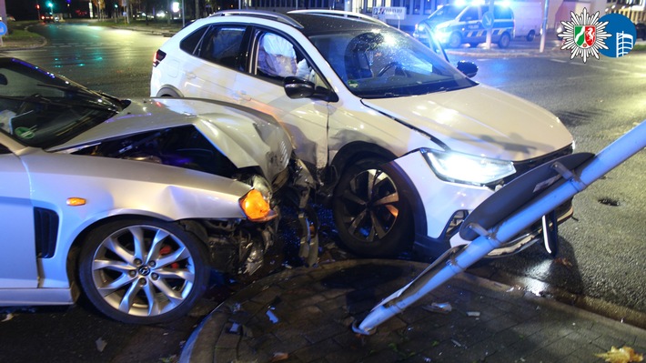 Im Kreuzungsbereich kollidierten beide Fahrzeuge, anschließend prallte eines der Autos gegen einen Verkehrszeichenmast, der dabei abknickte. Drei Personen wurden leicht verletzt.
