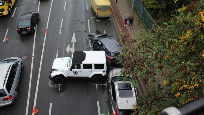 Nach Angaben eines Zeugen war ein weißer Kastenwagen (7,5t), mit einer bunten Aufschrift (vermutlich ein Lebensmitteltransporter), auf der rechten Fahrspur der Essener Straße in Richtung Essen unterwegs. Neben ihr auf der linken Spur eine Fahrzeugführerin mit einem weißen Wrangler Jeep. Weiteren Angaben zufolge soll der Kastenwagen den Jeep im Heckbereich gerammt haben. Unkontrolliert geriet der Wagen der Frau dann in den Gegenverkehr und prallte dort mit mehreren entgegenkommenden Fahrzeugen teilweise frontal zusammen. Insgesamt wurden vier Personen leicht verletzt und verblieben nach ambulanter Behandlung durch drei Rettungswagen der Feuerwehr Oberhausen vor Ort. Aufgrund des Unfalls, gefolgt von einer aufwendigen Spurensicherung, kam es zu erheblichen Verkehrsbehinderungen in Fahrtrichtung Oberhausen. Es liegen bisher keine weiteren Hinweise auf den weißen Kastenwagen, der mutmaßliche Unfallverursacher, vor.