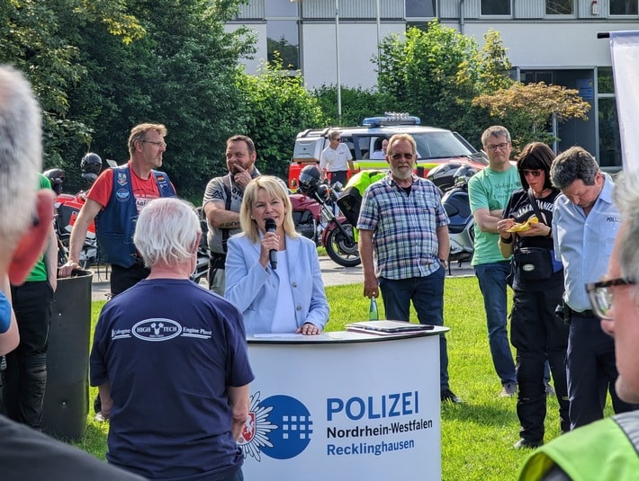 Polizeipräsidentin Friederike Zurhausen ließ es sich nicht nehmen, die Teilnehmerinnen und Teilnehmer am ADAC-Platz in Haltern am See bei der Abschlussveranstaltung in Empfang zu nehmen und sich auch bei den Organisatorinnen und Organisatoren der PoliTour zu bedanken: „Schon sieben Jahren lang gibt die Polizei Bikerinnen und Bikern wertvolle Tipps. Seit 2017 arbeiten die Polizeibehörden Recklinghausen, Coesfeld und Borken sogar zusammen an diesem Projekt. Diese Kooperation zahlt sich aus. Kradfahrende untereinander verstehen sich gut, sie sind wie eine kleine Familie. Direkte und offene Kommunikation ist daher sehr wichtig – und das ist das Konzept der PoliTour.“