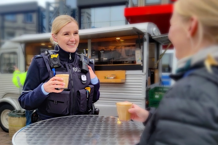 Das Format „Coffee with a cop“ wurde nach US-Vorbild vom Innenministerium ins Leben gerufen. Dort trinken schon seit Jahren Bürgerinnen und Bürger mit ihrer Polizei einen spontanen Kaffee, schaffen Vertrauen und lösen so das ein oder andere Problem im Gespräch.